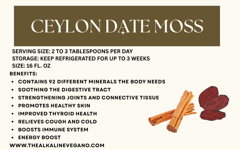 Our Ceylon Date Seamoss Gel is crafted from premium Chondrus crispus (Irish sea moss), carefully harvested and traditionally prepared to preserve its natural integrity. The sea moss is gently infused with Medjool dates and Ceylon cinnamon, creating a smooth, lightly sweetened gel with a warm, balanced flavor profile.